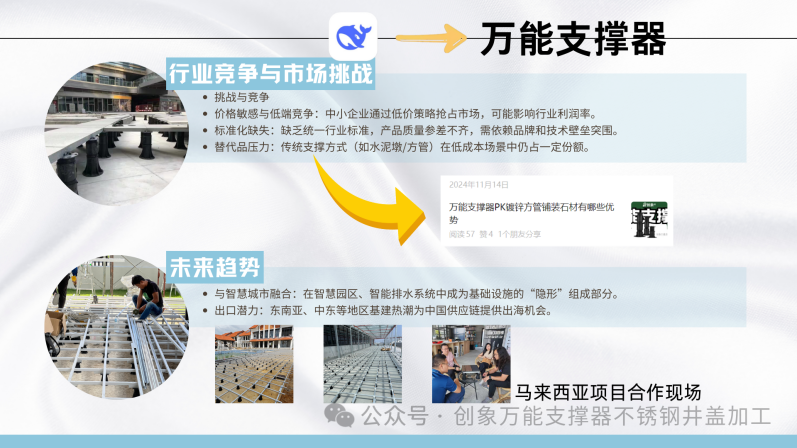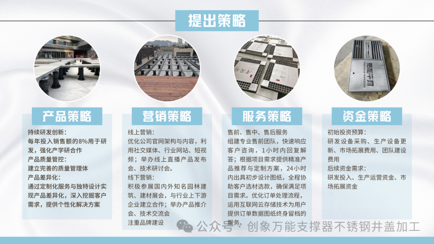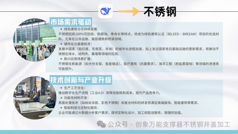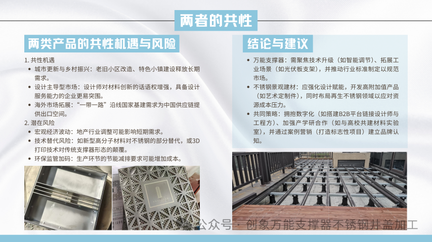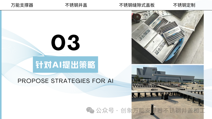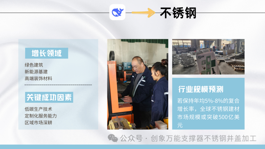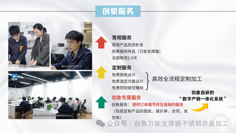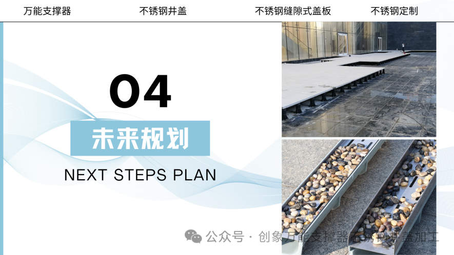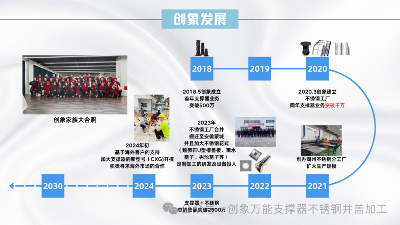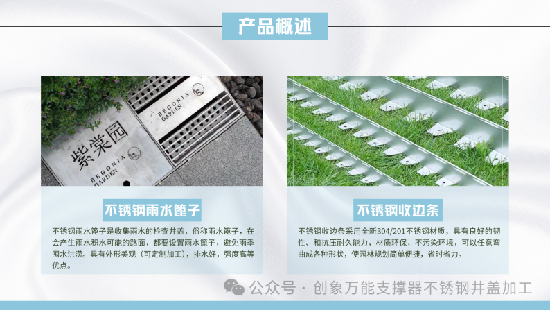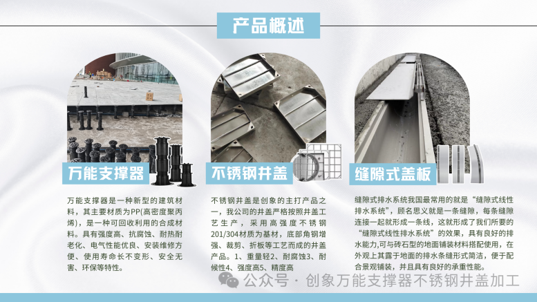 公司集自主研发、生产、销售、服务于一体,主要经营万能支撑器、不锈钢井盖、不锈钢缝隙式盖板、不锈钢收边条、不锈钢雨水箅子、不锈钢格栅、成品树脂水沟等不锈钢类产品的定制加工服务,提供系统化的专业支撑架空方案和不锈钢建材的定制化服务。
