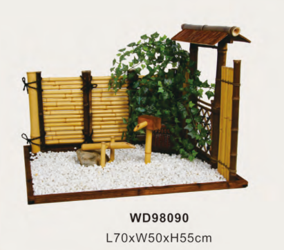 选用WD20489C碳化竹围栏围合庭院角落,搭配WD98090迷你小庭园与 WD20271B竹制花架,花架上摆放月季、绿萝等绿植,水车置于小型水池中,闲暇时坐在WD01-6A2 折叠竹椅上,听流水声、闻花香,仿佛置身山林间。
