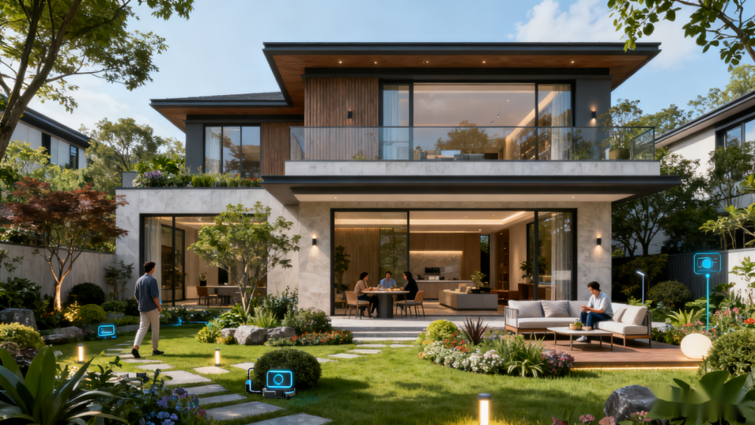 走出别墅,便是沉浸式庭院花园秘境:AI 庭院管家自动调控灌溉与驱蚊系统,物联网水景随光影流转;垂直绿化墙与四季花境相映成趣,凉亭下的户外沙发、烧烤区的烟火气,还原惬意户外生活;鱼池过滤设备、智能照明、园艺工具等实景呈现,从造园到养护的全流程一目了然。